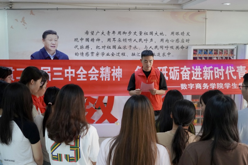 5月23日,“一站式”學生社區109會議室座無虛席。紅色宣講團成員、學生黨員王悅以“學習貫徹黨的二十屆三中全會精神,奮進新時代新征程”為題,向與會同學解讀了黨的二十屆三中全會的重大意義、核心要義和戰略部署。入黨積極分子、退伍復學軍人王亞琦則以一名軍人的視野,講述了對黨的二十大精神的認知和理解。他用通俗易懂的語言,將高深的理論轉化為生動的故事,讓在場的每一位聽眾都能聽得懂、記得住。