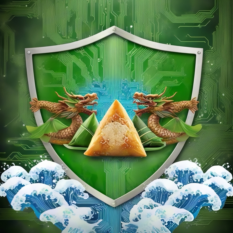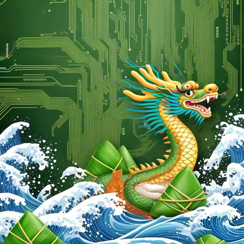 AI賦能文化傳播。智能網聯專業的同學嘗試用LoRA模型訓練出具有楚辭意境的畫風:輸入“紉秋蘭以為佩”,AI便生成佩戴數據流項鏈的屈原數字形象。最受歡迎的當屬“粽子生成器”,通過調整潛空間參數,竟創造出包含芯片餡料的“科技粽”,其粽葉紋理竟是由0-1代碼構成的楚國云紋。生成式AI創作的海報巧妙融合傳統元素與現代科技:威嚴的龍頭采用非遺雕刻數字化建模,船身則轉化為布滿元器件的綠色PCB電路板,每處焊點都對應《楚辭》中的星宿方位;浪花以動態的藍色電路走線呈現,模擬數據流傳輸效果,暗喻文化傳承的“信號永不中斷”。