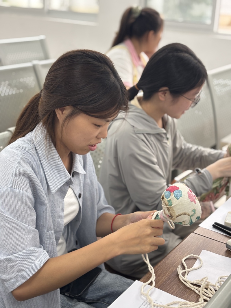 活動現場,指導老師帶領同學們走進艾草的文化世界,詳細介紹了艾草在傳統中醫中的重要地位。制作環節中,同學們滿心期待地開啟了手工之旅。桌上的粗布、艾草絨、棉花和棉線整齊排列。同學們跟隨老師的指導,將艾草絨與棉花均勻鋪在粗布上,仔細包裹;一手固定包裹好的材料,一手拿棉線小心纏繞,每一步都凝聚著專注與耐心。不少同學發揮創意,用彩色絲線纏繞出精美花紋,為艾灸錘增添獨特魅力。