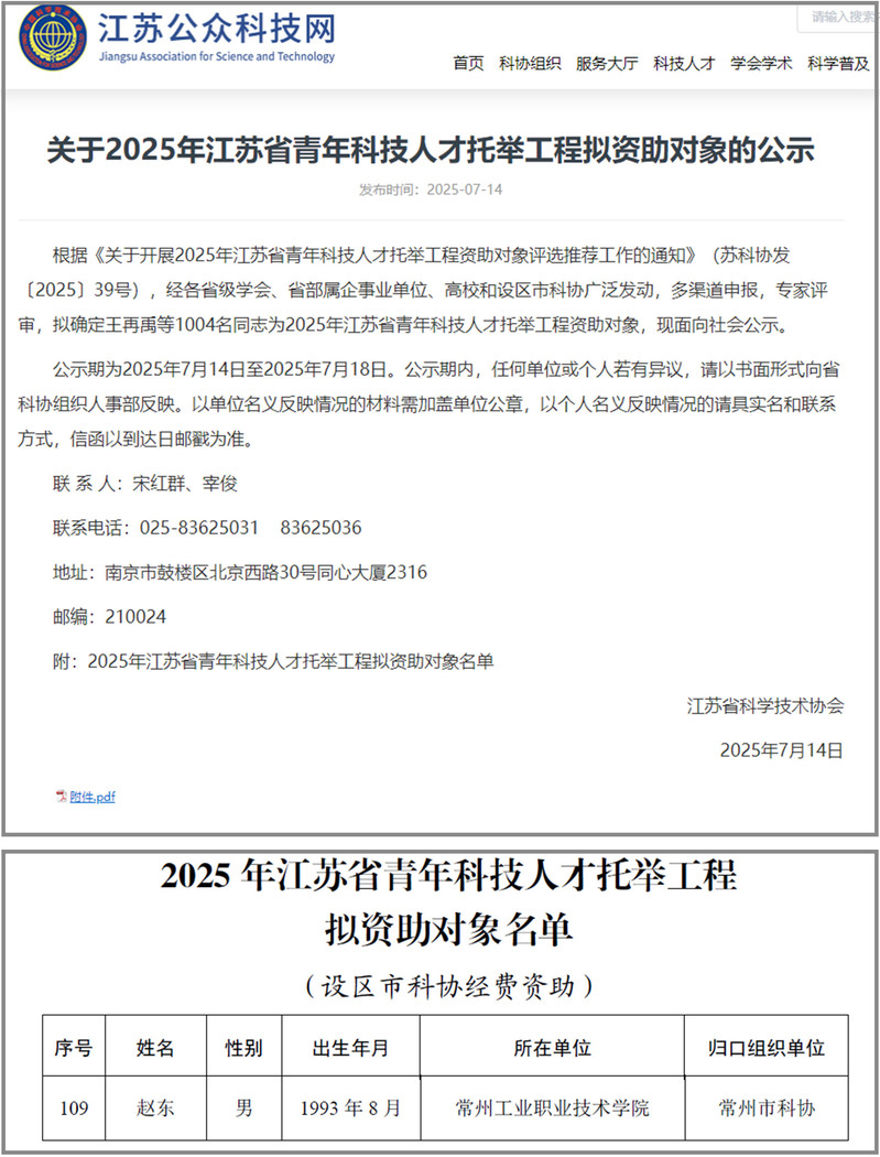 近日,江蘇省科學(xué)技術(shù)協(xié)會正式公布《關(guān)于公布2025年江蘇省青年科技人才托舉工程資助對象名單的通知》,我校材料工程學(xué)院趙東博士成功入選該人才項目資助對象。此次入選,標志著我校在高層次人才引培、高水平團隊建設(shè)方面取得了又一次突破。