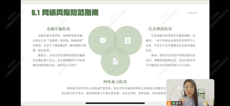 數字商務學院“小數點”心理輔導站陳雪老師圍繞校園環境、大學生心理與現實問題、家校共育目標、家庭教育策略及網絡風險防范五個方面展開闡述,并對家長的問題進行了詳盡解答。講解深入淺出,互動環節氛圍融洽,吸引了160名家長在線參與。