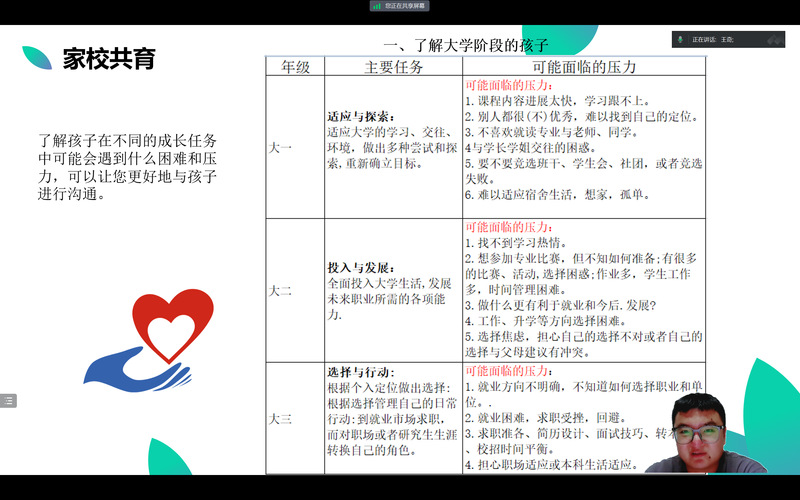 信息工程學院顧永振老師聚焦大學生心理發展特征、常見適應性問題與應對策略等主題,結合真實案例與專業解讀,為家長深入剖析當前大學生常見心理困境及其成因,引導家長科學認知心理健康問題的普遍性與可干預性。
