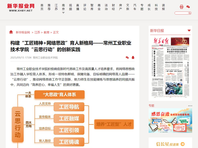 新華報業網:構建“工匠精神+網絡思政”育人新格局——常州工業職業技術學院“云思行動”的創新實踐