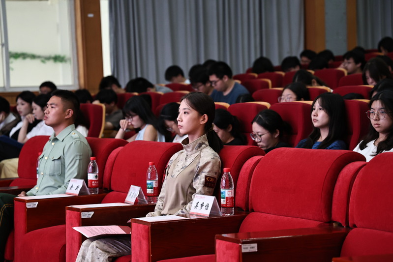 活動(dòng)的第二篇章聚焦“正青春”的奮斗故事。吳夢(mèng)怡以《我的“正”青春》為題,分享了她在閱兵訓(xùn)練場(chǎng)上揮灑汗水、在閱兵方隊(duì)中見證榮光的感人經(jīng)歷。她用自己的故事詮釋了新時(shí)代青年的責(zé)任與擔(dān)當(dāng)。在現(xiàn)場(chǎng)互動(dòng)環(huán)節(jié),余新從幕后工作者的視角出發(fā),就現(xiàn)場(chǎng)感受、歷史傳承、青春理想等話題與同學(xué)們進(jìn)行了深入交流,現(xiàn)場(chǎng)氣氛熱烈。兩位青年榜樣作為榮光的親歷者,讓抽象的“信仰”變得具體而鮮活,引發(fā)了在場(chǎng)同學(xué)的強(qiáng)烈共鳴。