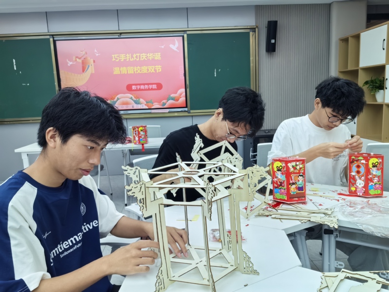 此外,旅游與康養(yǎng)學院將關(guān)懷直接送至學生社區(qū)。黨總支副書記郭媛帶領(lǐng)學工團隊走進“一站式”社區(qū)的“旅途會客廳”,與留校學生圍坐交流,隨后更深入宿舍,實地了解同學們的住宿環(huán)境與生活保障,親切詢問“宿舍還住得習慣嗎?”“學習上有沒有困難?”,將深切關(guān)懷送至每一位學子身邊。數(shù)字商務學院精心組織了“巧手扎燈慶華誕,溫情留校度雙節(jié)”主題活動。在輔導員的指導下,留校學生們親手制作燈籠,繪制五星紅旗,書寫美好寄語。一盞盞點亮的手工燈籠,不僅鍛煉了學生的動手能力,更成為了一堂生動的傳統(tǒng)文化實踐課,讓學子在體驗中紓解鄉(xiāng)愁,凝聚家國情懷。
