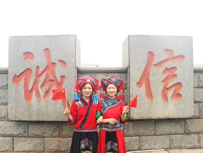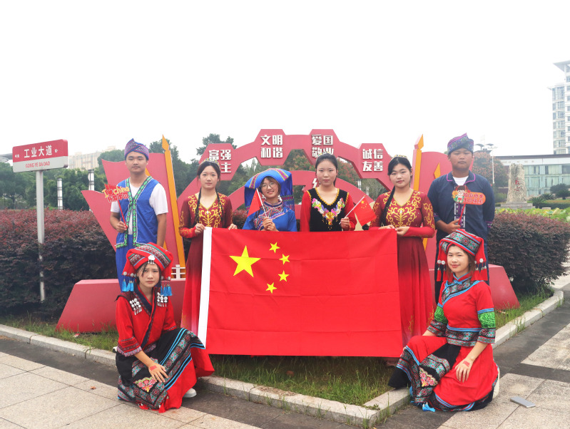 在“我與國(guó)旗合張影”創(chuàng)意攝影活動(dòng)中,同學(xué)們身著各具特色的民族盛裝,與鮮艷的五星紅旗創(chuàng)意同框。壯族學(xué)生身著絢麗的民族服裝,手舉祝福祖國(guó)的標(biāo)語牌和小國(guó)旗;土家族學(xué)生身著傳統(tǒng)織錦服飾,在國(guó)旗下歡快展示擺手舞的獨(dú)特韻味。同學(xué)們還自發(fā)組成“同心圓”隊(duì)形,寓意各民族像石榴籽一樣緊緊抱在一起。這些充滿創(chuàng)意的合影,既展現(xiàn)了各民族文化的豐富多彩,又表達(dá)了各族青年對(duì)祖國(guó)的深厚情感。