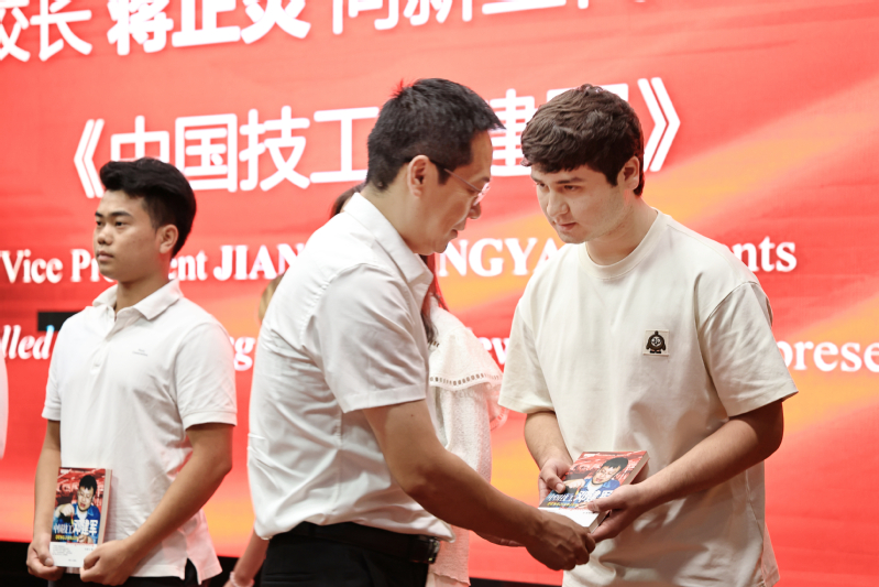 蔣正炎為新生代表贈送校本教材《中國技工鄧建軍》,鼓勵同學們學習“中國工匠精神”,在專業學習和實踐中不斷超越自我。學工處處長邢凱嶺為新生代表頒發新生獎學金,希望大家志存高遠、勤學篤行,在常工業實現人生的新跨越。