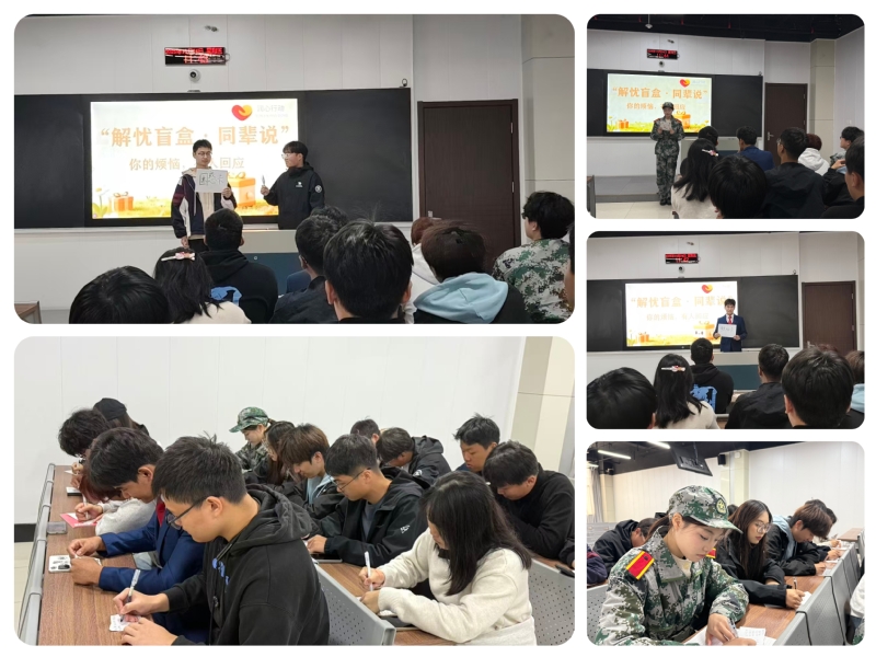 在“解憂盲盒·同輩說”活動中,50余名學生齊聚一堂,通過匿名投遞與隨機抽取“心事”的方式,以同輩視角為彼此的煩惱寫下暖心回應與建議。活動營造了真誠開放的交流氛圍,讓學生在“傾聽”與“被傾聽”中感受到情感共鳴與支持,初步構建起同輩心理互助的有效通道。