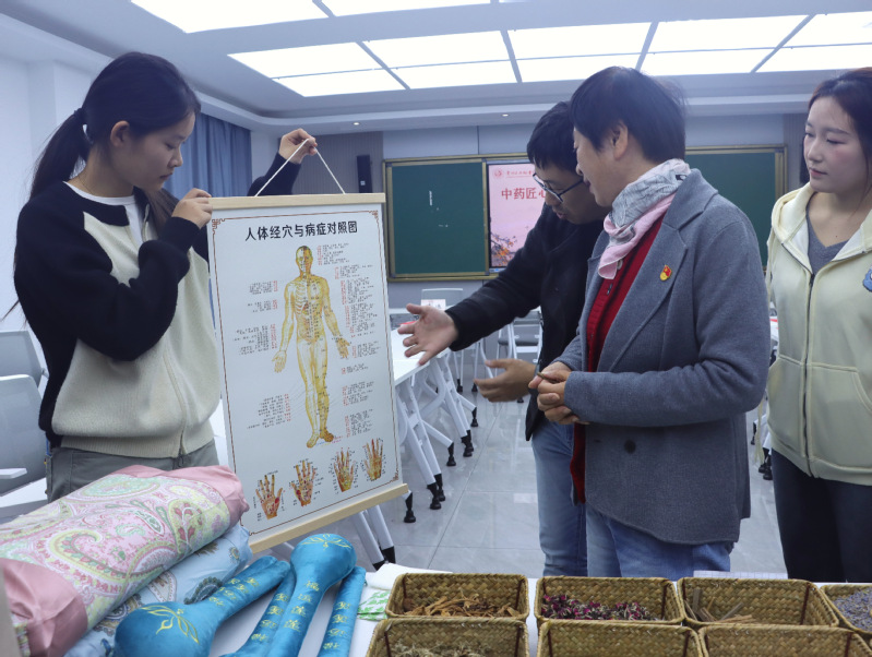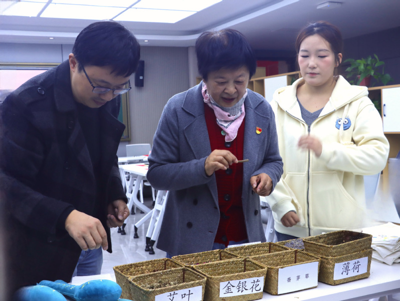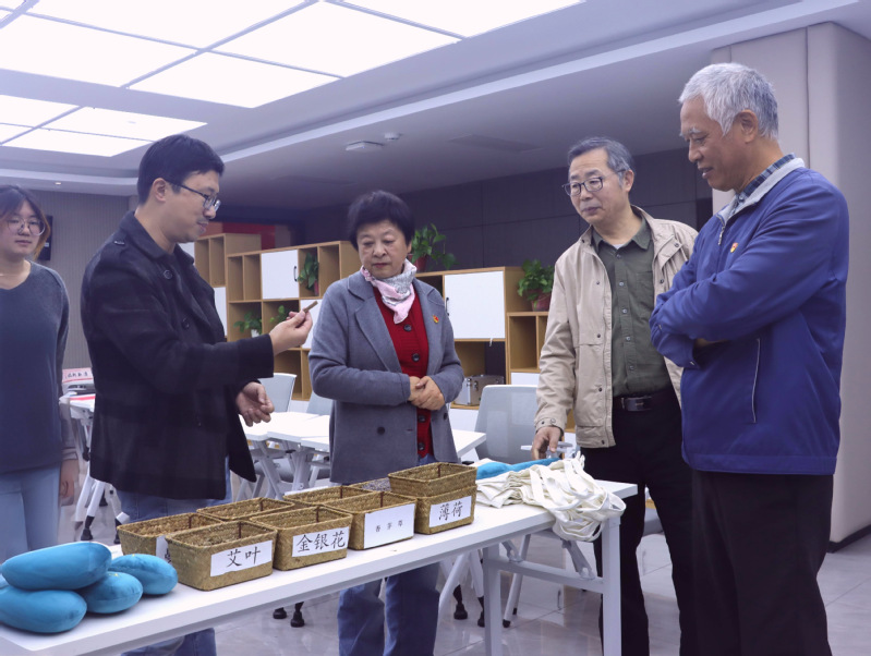 活動現(xiàn)場,本草社學生向三位老同志展示了自主研發(fā)的中藥養(yǎng)生錘、中藥枕、中藥香皂和艾草貼等文創(chuàng)產(chǎn)品。學生結合人體經(jīng)絡圖,詳細講解了艾草、薰衣草等藥材的配伍原理及功效,現(xiàn)場演示穴位按摩手法。張燏試用中藥養(yǎng)生錘后,對學生的創(chuàng)新設計給予高度評價:“將傳統(tǒng)藥材與現(xiàn)代工藝結合,既弘揚了中醫(yī)藥文化,又體現(xiàn)了青年學子的實踐智慧。”金華仁和趙呂明還與學生互動體驗了辨識藥材、調(diào)配藥材比例等環(huán)節(jié),感受“藥食同源”的文化魅力。三位老同志分別與家庭困難學生結對幫扶,現(xiàn)場互留聯(lián)系方式。三位老同志結合自身經(jīng)歷,勉勵學生扎根專業(yè)、服務社會。