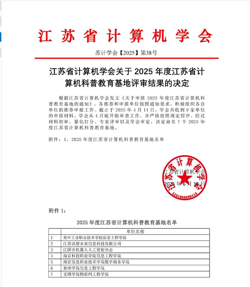 11月2日,從第二屆江蘇省計算機教育大會傳來喜訊,我校信息工程學院獲評“江蘇省計算機科普教育基地”,并由江蘇省計算機學會正式授牌。