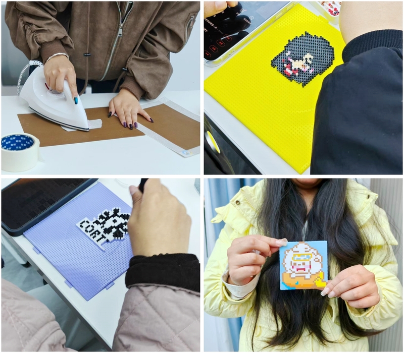 活動場地內,長條桌鋪著淺色桌布,透明收納盒整齊排列,其中分門別類盛放著紅如櫻桃、藍似海水、黃如陽光等各色拼豆,更有漸變色與閃粉豆點綴其間,在燈光映照下熠熠生輝,激發了同學們的創作興趣。桌角備有參考樣圖,涵蓋可愛動物、卡通形象、幾何圖形及祝福語句等多種主題,鑷子等工具一應俱全,為參與者提供了便利的創作條件。