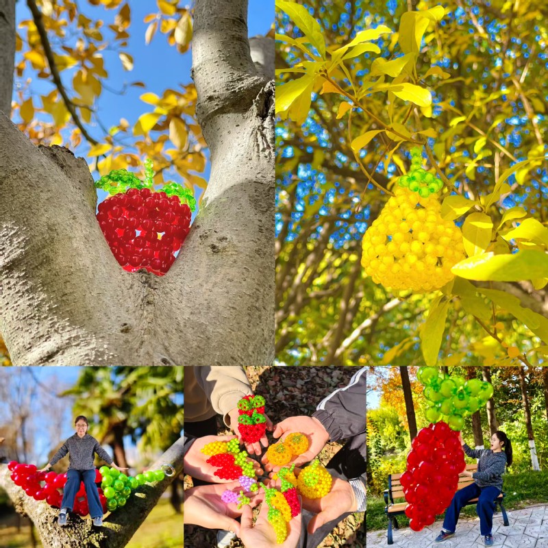 活動當天,新手在社團骨干的指導下掌握“十字穿珠法”,熟練者則挑戰“立體疊編”技法,零散的彩珠在指尖化作鮮活的“果蔬藝術品”。更有創意之作將串珠果蔬串聯成掛飾或擺件,置于校園秋景中,與黃葉藍天相映成趣,成為“秋日限定風景”。