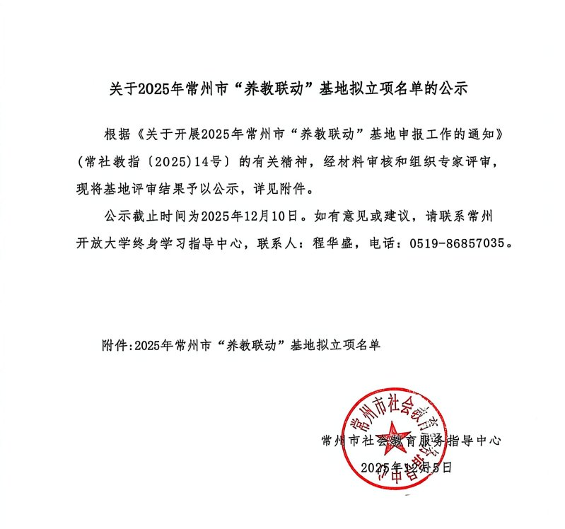 近日,常州市2025年度“養教聯動”基地申報創建結果揭曉,我校憑借與橄欖城社區深度合作開展的系列老年教育活動,從眾多申報單位中脫穎而出,成功入圍市級示范基地創建名單,這也是對我校踐行“服務全民終身學習”理念的生動肯定。