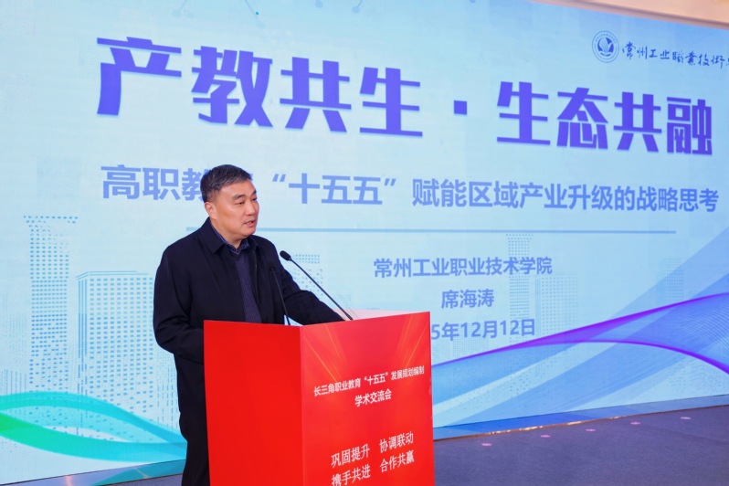 在主旨報告環節,我校黨委書記席海濤作為長三角地區江蘇高職院校代表,作《產教共生·生態共融——高職教育“十五五”賦能區域產業升級的戰略思考》專題報告。他指出,“十五五”時期高職教育的核心使命在于緊密對接《教育強國建設規劃綱要(2024-2035年)》文件要求,成為服務新質生產力發展的“主基地”、促進更高質量就業的“穩定器”、構建融通融合體系的“立交橋”、教育教學化轉型的“先行區”以及服務國家戰略的“助推器”。他通過對比長三角、粵港澳大灣區、京津冀等三大城市群數據,展現了長三角地區雄厚的產業基礎與活躍的經濟動能,特別是江蘇高校資源豐富和一流企業集群的顯著優勢。
