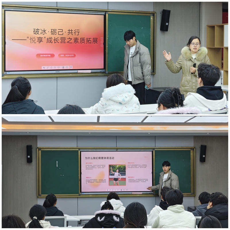 活動采取“室內引導、室外實踐”的模式分階段進行。室內引導環節,24國際商務532班勵志獎學金獲得者們圍繞“破冰·礪己·共行”的核心設計理念,闡釋了體育活動對促進身心健康、激發積極心態的正向作用,并簡要說明了后續環節的流程與安全須知,為戶外實踐奠定了認知基礎。