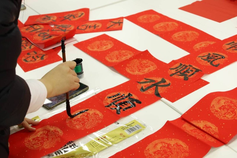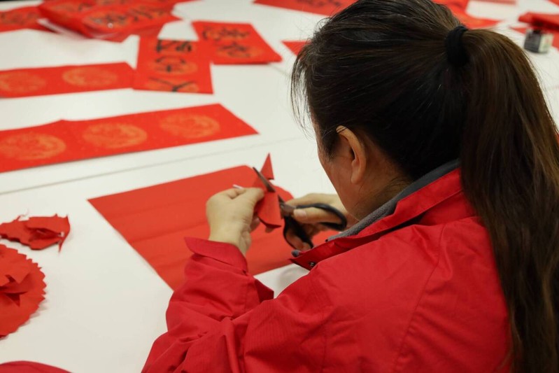 在剪紙活動環(huán)節(jié),紅紙折疊,剪刀穿梭,同學們與宿管阿姨們相互切磋,耐心指導。不一會兒,各式精巧的窗花便躍然桌上,既有傳統(tǒng)的“福”字、生肖圖案,也不乏同學們結(jié)合專業(yè)特色創(chuàng)意設(shè)計的康養(yǎng)主題紋樣。書寫對聯(lián)環(huán)節(jié)更是墨香四溢,擅長書法的同學揮毫潑墨,一副副寄托美好祝愿的春聯(lián)一氣呵成;初次嘗試的宿管人員和同學們也興致勃勃,在旁學習握筆、運筆,寫下對新年的樸素期盼。
