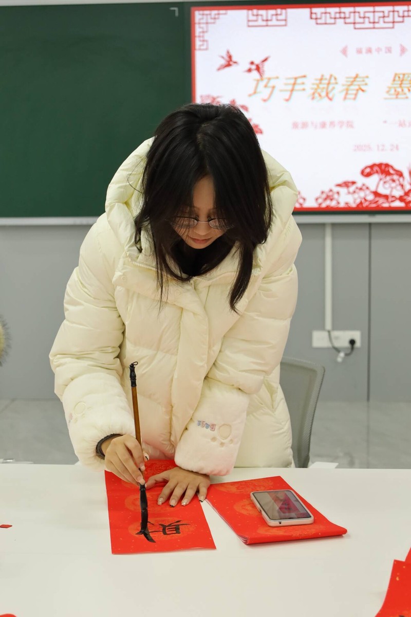 12月24日,旅游與康養(yǎng)學院于“一站式”學生社區(qū)舉辦“巧手裁春,墨韻迎福”迎新年主題活動。學院輔導員老師、學生代表與物業(yè)宿管人員歡聚一堂,通過剪窗花、寫春聯(lián)等方式,共同迎接2026年的到來。