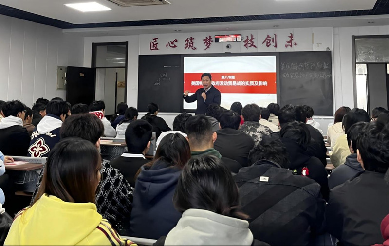 11月11日,黨委委員、副校長姚慶文為2024級計(jì)算機(jī)網(wǎng)絡(luò)專業(yè)學(xué)生講授“美國特朗普政府發(fā)動(dòng)貿(mào)易戰(zhàn)的實(shí)質(zhì)及影響”專題思政課。姚慶文從美國政治體制與對外行為的特點(diǎn)切入,聚焦特朗普政府發(fā)動(dòng)的對華貿(mào)易戰(zhàn),通過對比分析,深刻揭示美國以“公平貿(mào)易”為名、行單邊保護(hù)之實(shí)的實(shí)質(zhì),闡明對華貿(mào)易戰(zhàn)對中美兩國乃至全球經(jīng)濟(jì)產(chǎn)生的深遠(yuǎn)影響,勉勵(lì)學(xué)生清醒認(rèn)識國際形勢的復(fù)雜性,樹立正確歷史觀、大局觀,堅(jiān)定“四個(gè)自信”,將個(gè)人成長融入國家發(fā)展大局,勤學(xué)篤行、奮發(fā)有為,為實(shí)現(xiàn)中華民族偉大復(fù)興貢獻(xiàn)智慧與力量。