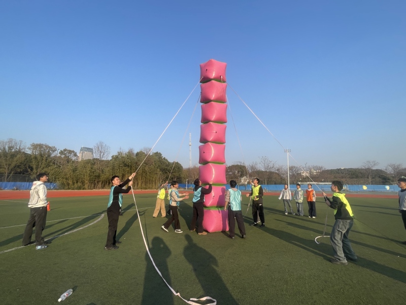 室外賽場上,各項趣味賽事競爭激烈。選手們沉穩發揮,為團隊奮力拼搏?!瓣懙佚堉劢恿悺敝袔捉M隊員步調一致,奮力爭先;“不倒森林”中,各參賽隊依令迅速轉動手中道具,現場加油聲不斷;“步步高升”中同學們奮力壘出“人生”新高度;“超級障礙賽”環節退役大學生與國護隊隊員分兩組,翻越各種障礙,接力沖刺,現場觀眾吶喊助威,氣氛熱烈。