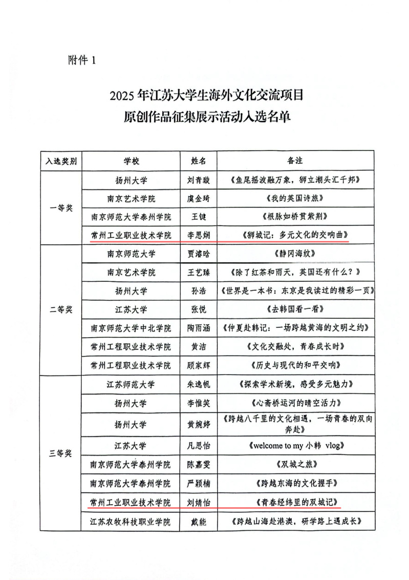 近日,2025年江蘇大學生海外文化交流項目原創作品征集展示活動評選結果揭曉。我校學生憑借扎實的文化素養與鮮活的海外交流體悟,在活動中脫穎而出,共有2件作品獲獎。