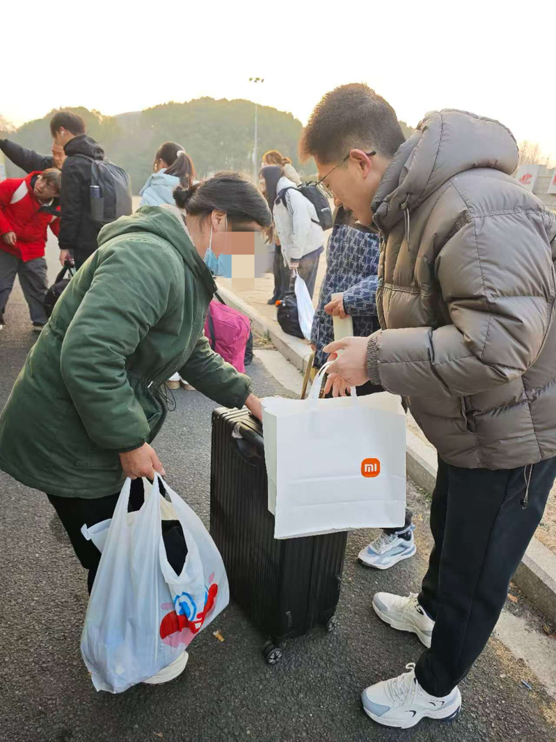 出發前,老師們細心幫助學生整理行李,攙扶他們下樓上車,并親自駕車護送學生至交通站點。在常州火車站,杜嘉豪老師全程陪同學生完成進站、安檢流程,反復叮囑學生注意安全,保持聯系;另兩名需乘大巴返鄉的學生則由王杰老師負責,不僅護送學生抵達汽車客運站,還主動協助隨行家長安置行李,細致核對發車信息。兩位老師均向學生贈送了學院精心準備的暖心伴手禮,讓學生倍感溫暖。